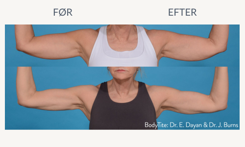 Har du til gengæld mere udtalt løshed af huden vil det være nødvendigt at fjerne denne hud, for at opnå en god kontur. Dette Betyder at der efterlades et ar på indesiden af overarmen indtil 1-2 cm før albuen. Vi kombinerer også her med UL behandling, for mere fasthed og for kortere ar.